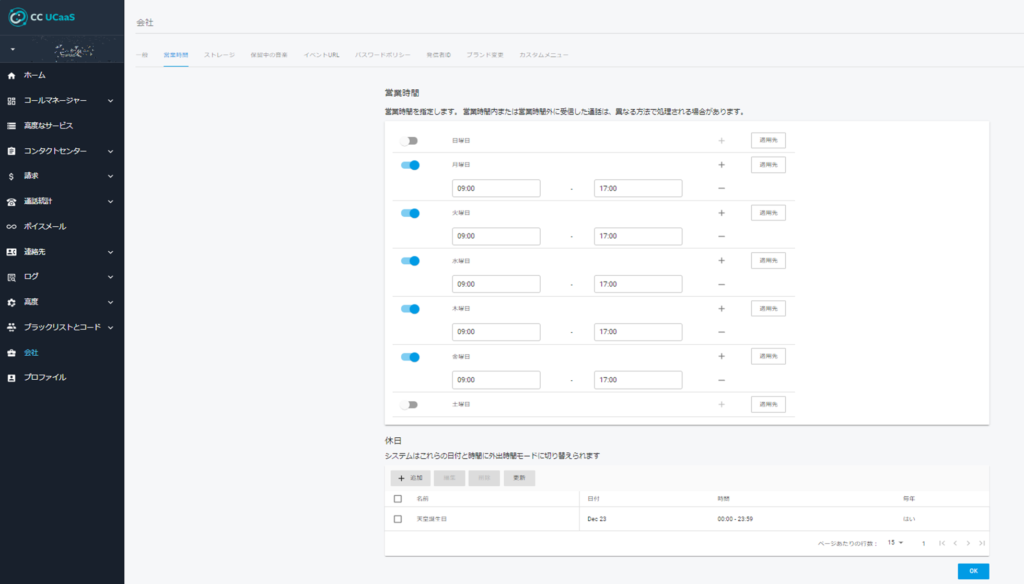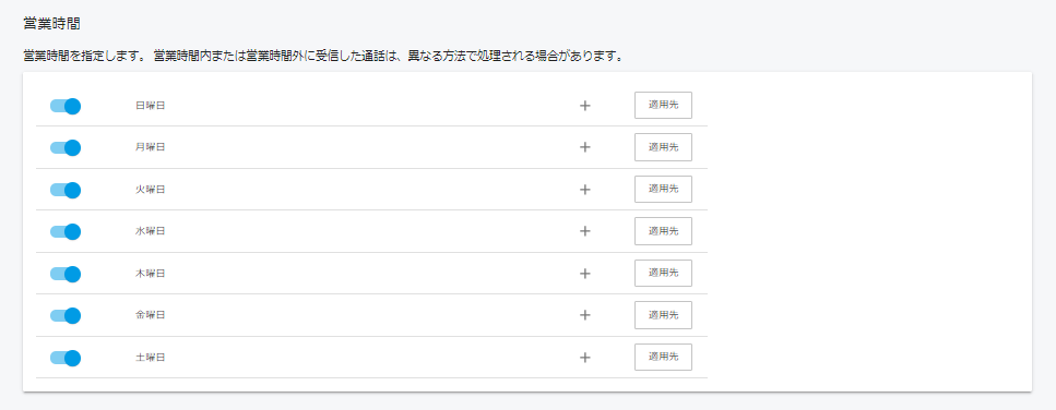 各グループ、メンバーに共通の営業時間、休日の設定を作成することができます。バーチャル受付(IVR)の機能、発着信のルールの設定等で営業時間ごとに設定を変更する必要がある際は設定をしておく必要があります。