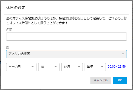 休日の設定は、画面下部休日メニューの[追加]を押下すると以下のようなポップアップが表示されます。日本の祝日は登録されておりませんので、初期設定時に設定することをおすすめします。
