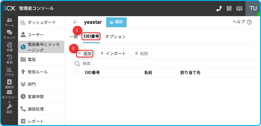 ●Admin Consoleから”電話番号とメッセージング”を選択し、該当のVoIP Gatewayをクリックし、ページ上部の”DID 番号”タブをクリックします。