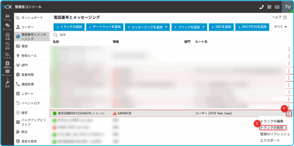 ●Admin Consoleから”電話番号とメッセージング”を選択し、該当のSIP Trunkの右側にある:印を押してトランクの削除をクリックします。