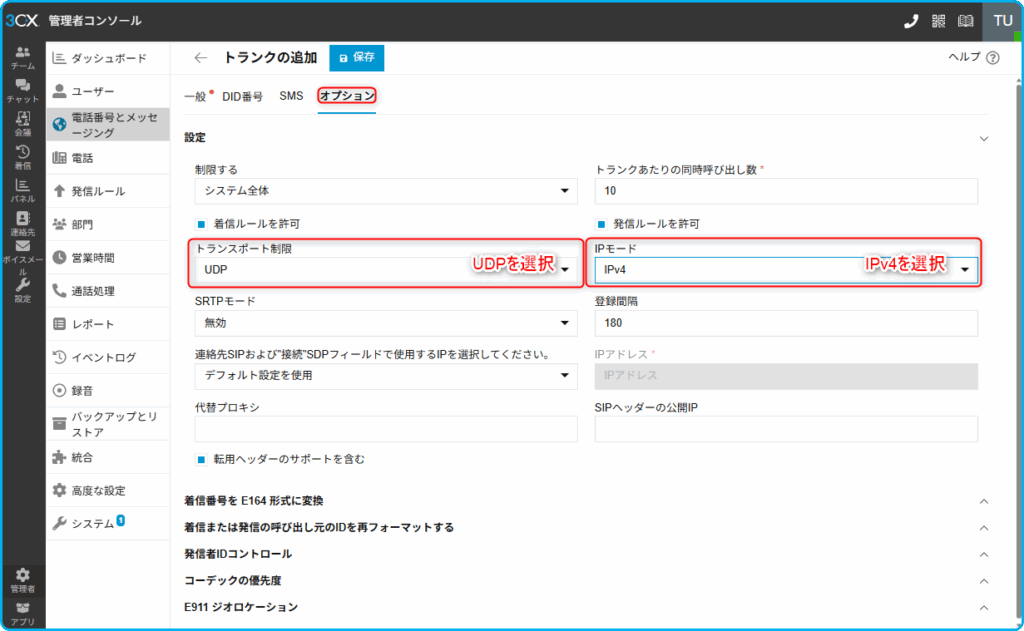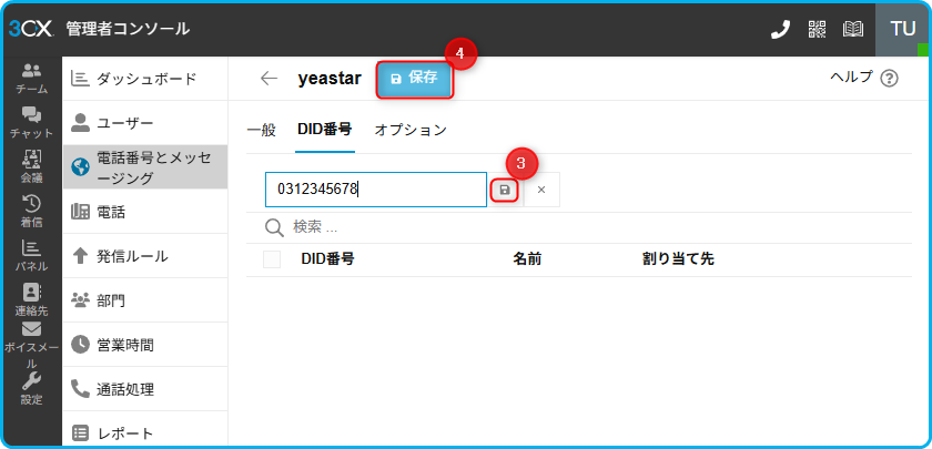 割り当てられたDID番号で使用するDIDを選択します。その後画面上部の保存をクリックします。