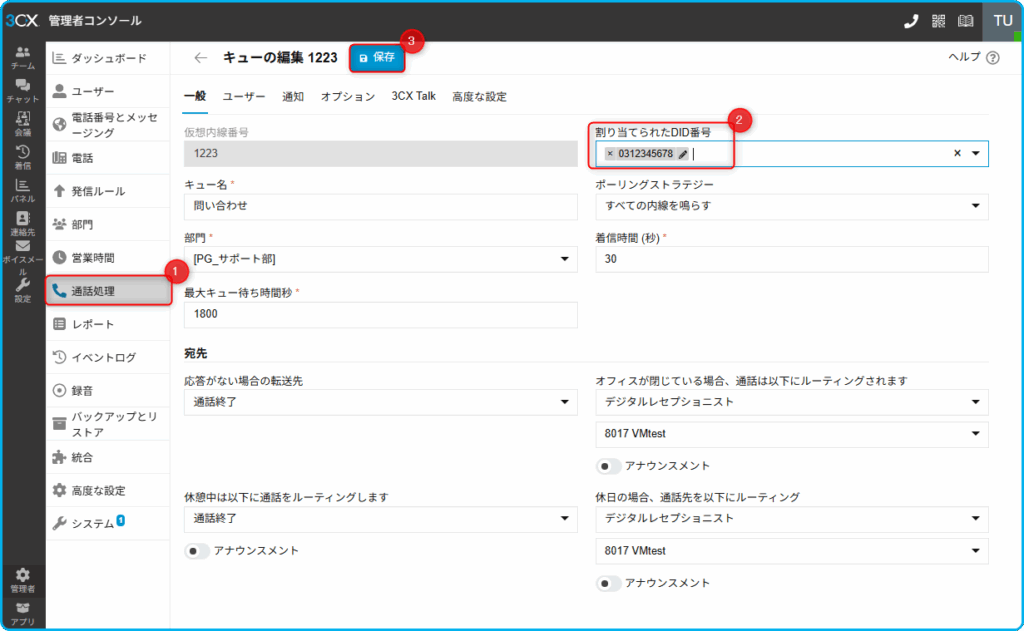 ●DID番号を利用するIVR/コールキュー/着信グループの編集を行います(例図はコールキュー)