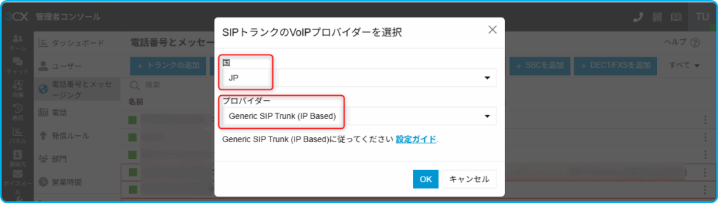 ●Admin Consoleから”電話番号とメッセージング”を選択し、開いたページ上部の”トランクの追加”をクリックします。