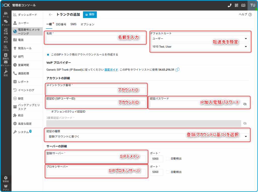 ※番号設定は既存で登録されている番号に沿って登録してください。回線の種別によっては市外局番を抜いて登録しなければならない等の制約があります。