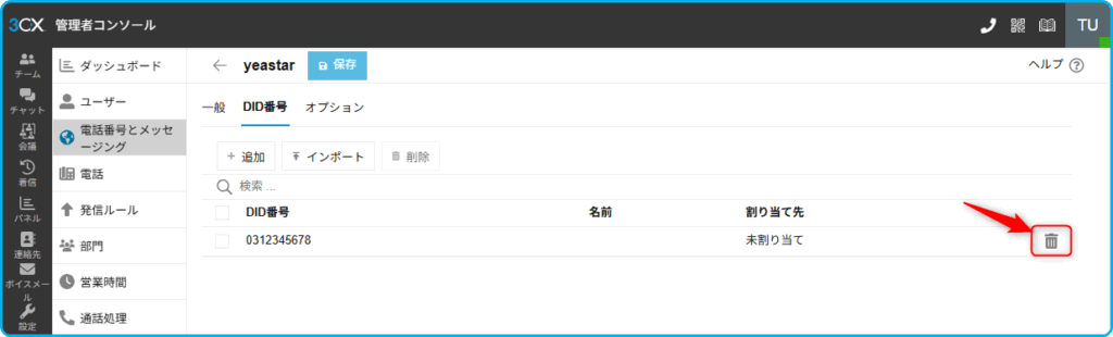 ●該当の番号を再利用しない(解約済みなど)の場合はGatewayのDID番号からも番号を削除しますAdmin Consoleから”電話番号とメッセージング”を選択し、該当のGateway→DID番号タブに進み削除するDIDの右側にあるゴミ箱アイコンを押下して削除します。
