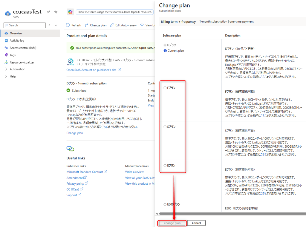 以下は、Azure Marketplace 上でサブスクリプションのプランを変更する際の一般的な操作手順です。
