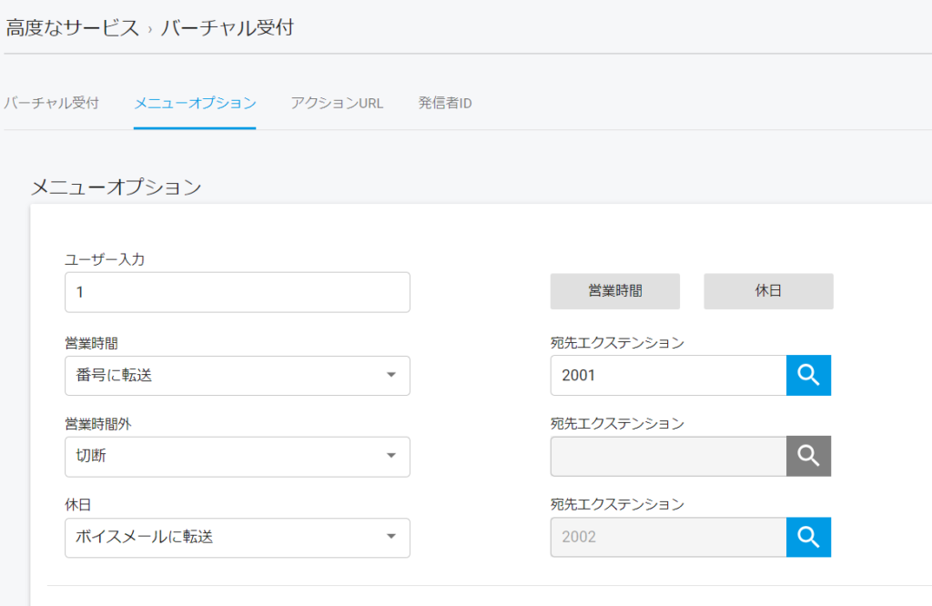 • ユーザー入力:仮想受付がユーザーの入力に一致する内線番号の検索を開始するタイミングを制御できます。呼び出し元が DTMF キー 1を押すと、次の動作が想定されます。・現在の時刻が営業時間内の場合、コールは内線番号 2001 に転送されます。・営業時間外の場合、電話は切れます。・休日中の場合、通話は内線番号2002のボイスメールに転送されます。