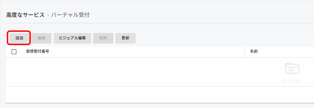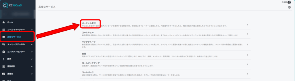 右部メニューの「高度なサービス」→「バーチャル受付」を選択してください。