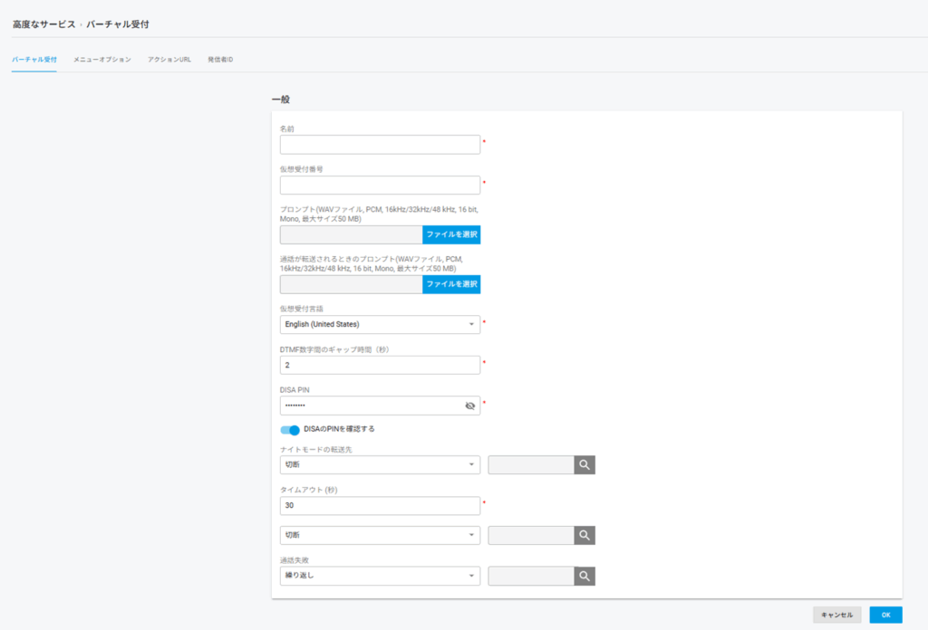 DISA PIN: 仮想受付内でDISA機能を設定する場合は、DISA機能にアクセスするためのPINを設定できます。詳細については、Direct Inward System Accessを参照してください。