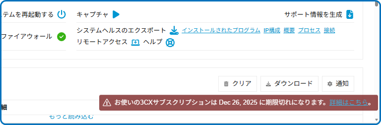 「お使いの3CXサブスクリプションは ______ に期限切れになります。詳細はこちら。」