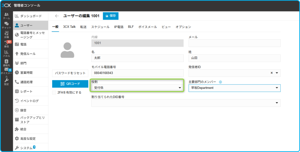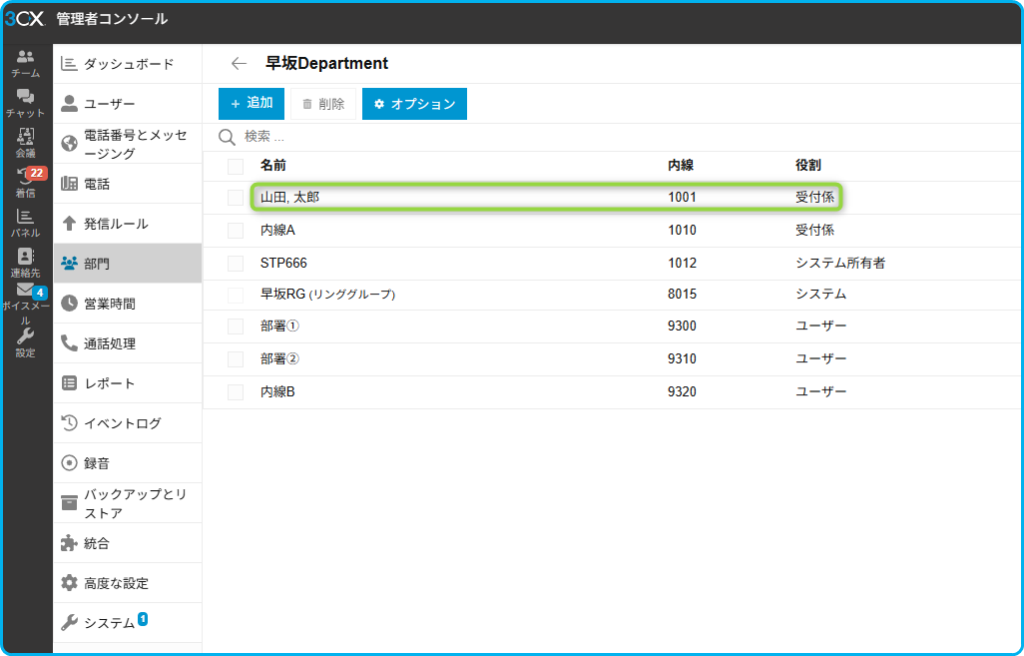 ①前準備として営業時間を変更したい部門に受付係以上のユーザーを該当の部門に所属させます。