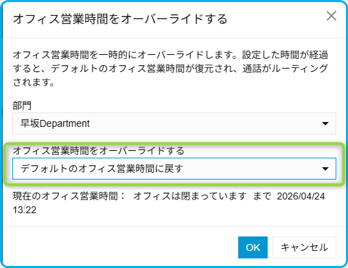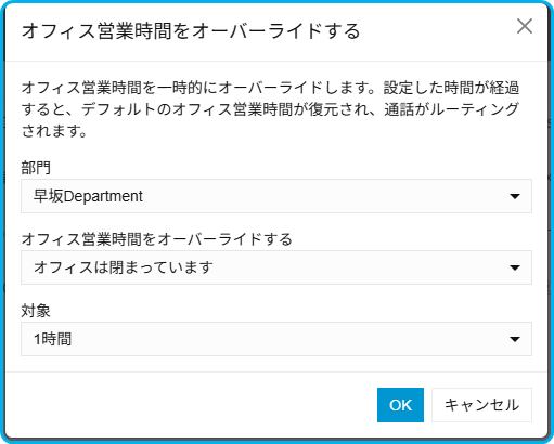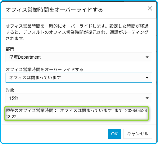 下の例では、現時点から1時間営業時間外に設定しています。